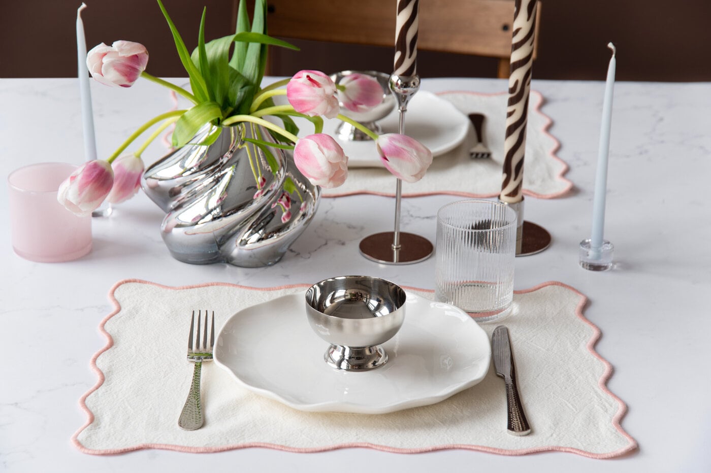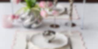 A classic white table setting with elegant silver accents and subtle patterns. Add fresh tulips in a statement vase that catches the eye. This table setting is perfect for spring brunches, dinner parties, or festive occasions.